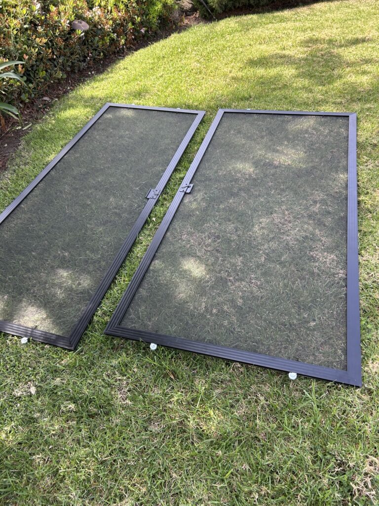 Installing a new sliding screen door on a French doors set in Ventura. My clients always wanted to be able to open these double french doors that open in but kept getting flies in the room and were sick of it! We have installed sliding screen doors like this since the early 1990’s We simply adapt it for a sliding screen door frame by adding top and bottom channel and building a top of the line sliding screen door.